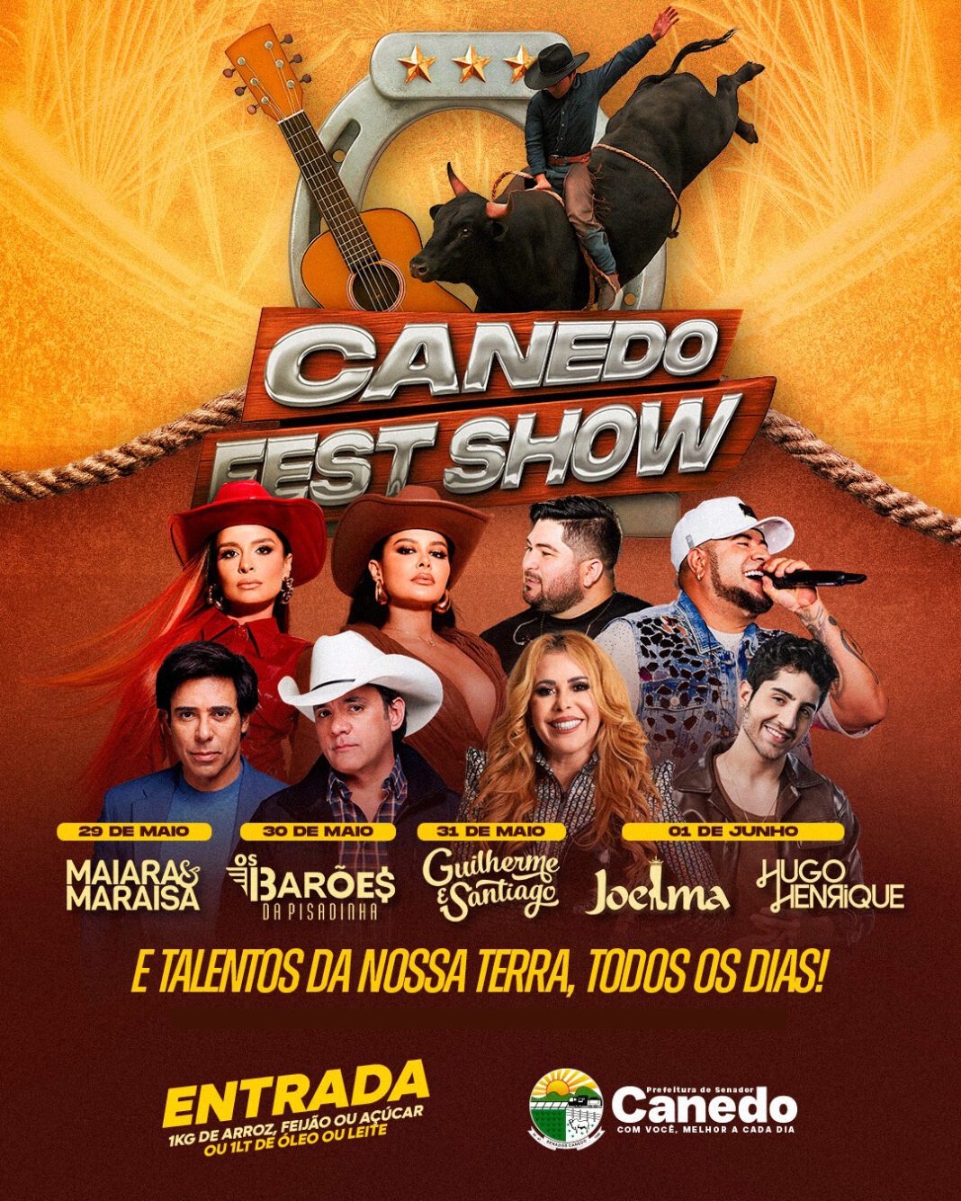 Senador Canedo já está em contagem regressiva para um dos eventos mais esperados do ano. Em comemoração aos 36 anos de emancipação política, a cidade realiza mais uma edição do Canedo Fest Show, que acontece entre os dias 29 de maio e 1º de junho, na Estação da Cultura. Com uma proposta que une diversão, tradição e responsabilidade social, o evento terá entrada solidária: para acessar cada noite de shows e rodeios, basta doar 1 kg de alimento não perecível ou 1 litro de leite ou óleo.