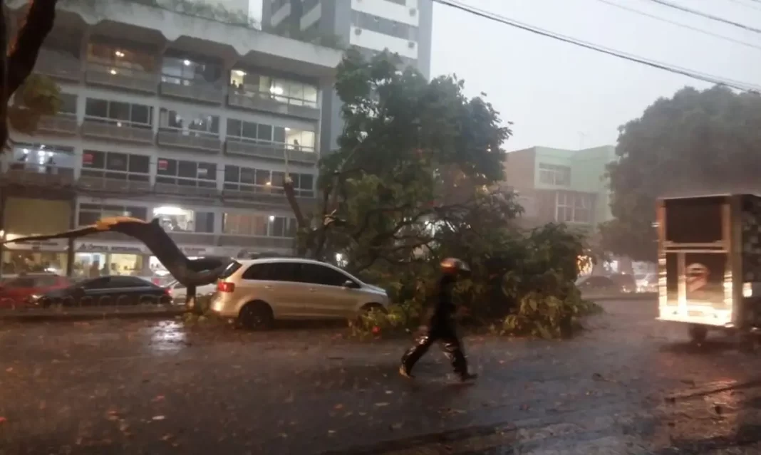 Em uma avenida, uma árvore atingiu a rede elétrica e levou os postes abaixo. Um deles atingiu uma moto, e o motociclista foi levado para o hospital.